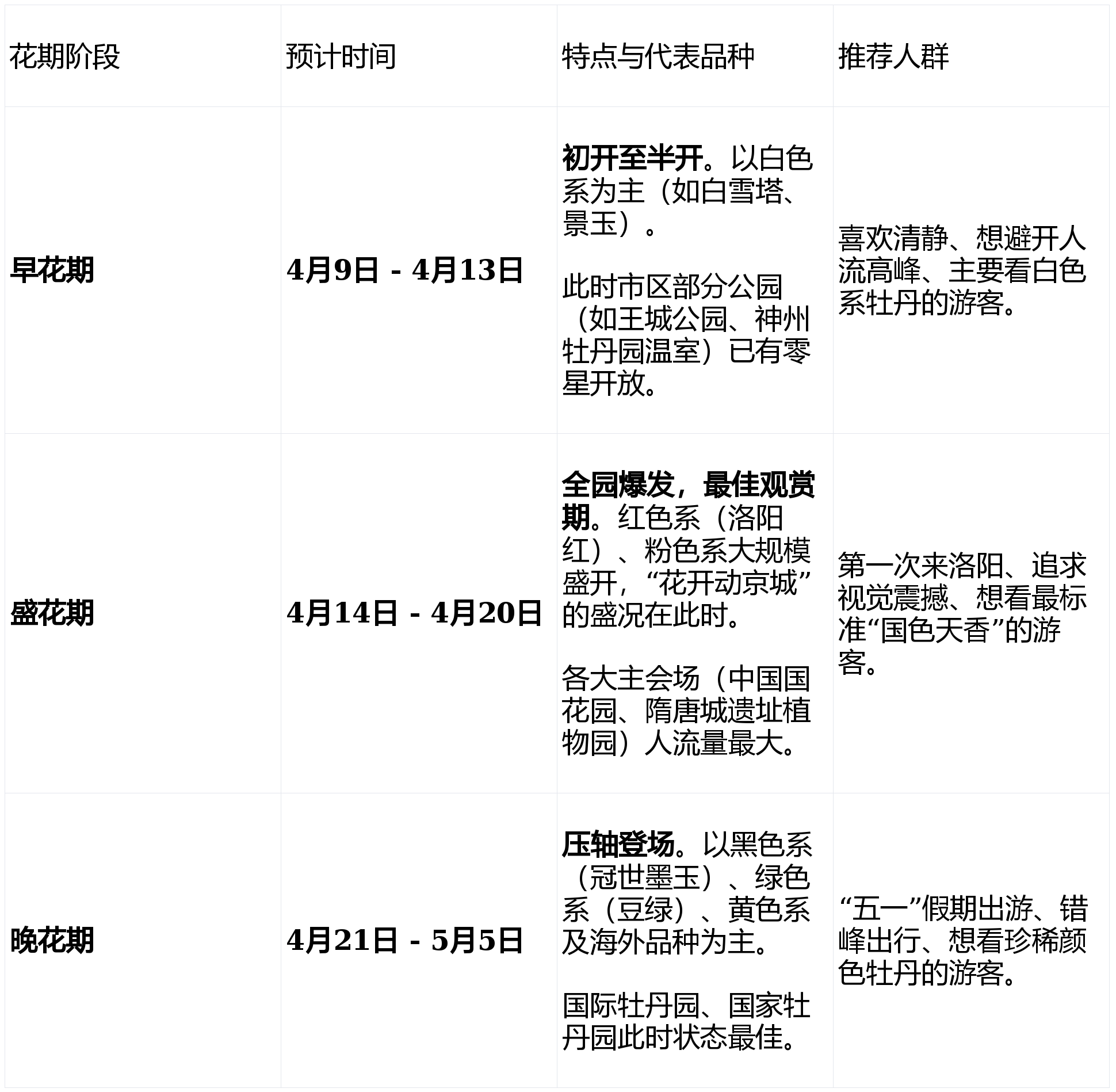 由于牡丹品种繁多,花期分早、中、晚三批开放,建议您根据出行时间选择重点园区: